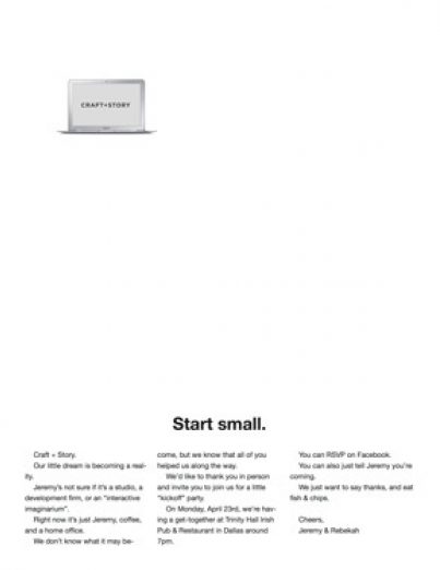 So, “starting small” has now become an asset for Craft + Story. I’m no longer ashamed of my single-person company or our lack of awards and “brand equity” in the community. We might get bigger. We might become better known. Even if that never happens, I learned that my job is to do the best with what I have right now.